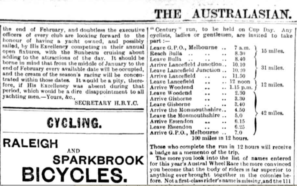 As ever in the 1890s, no significant cultural phenomena could pass without being celebrated in song, and Melbourne Punch, the home of so many cycling journalists, published The Cyclists Song in 1895 which included the verse, “When I fly along where the wattle grows And its scent to the wind of heaven throws,”