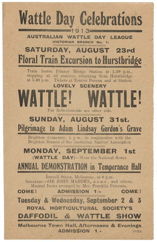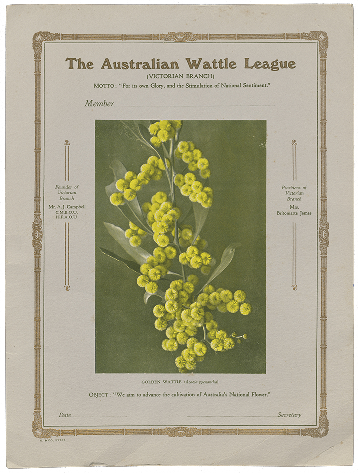 The Australian Natives Association, an organization to promote the betterment of Australian born Europeans, was quick to take up the call. The wattle had for sometime been an unofficial symbol of Australia and their women’s group had been launched as The Wattle League. Heading towards Federation, notions of national sentiment and an identity distinct from Britain ran high and the call to defend the wattle fell on primed ears.