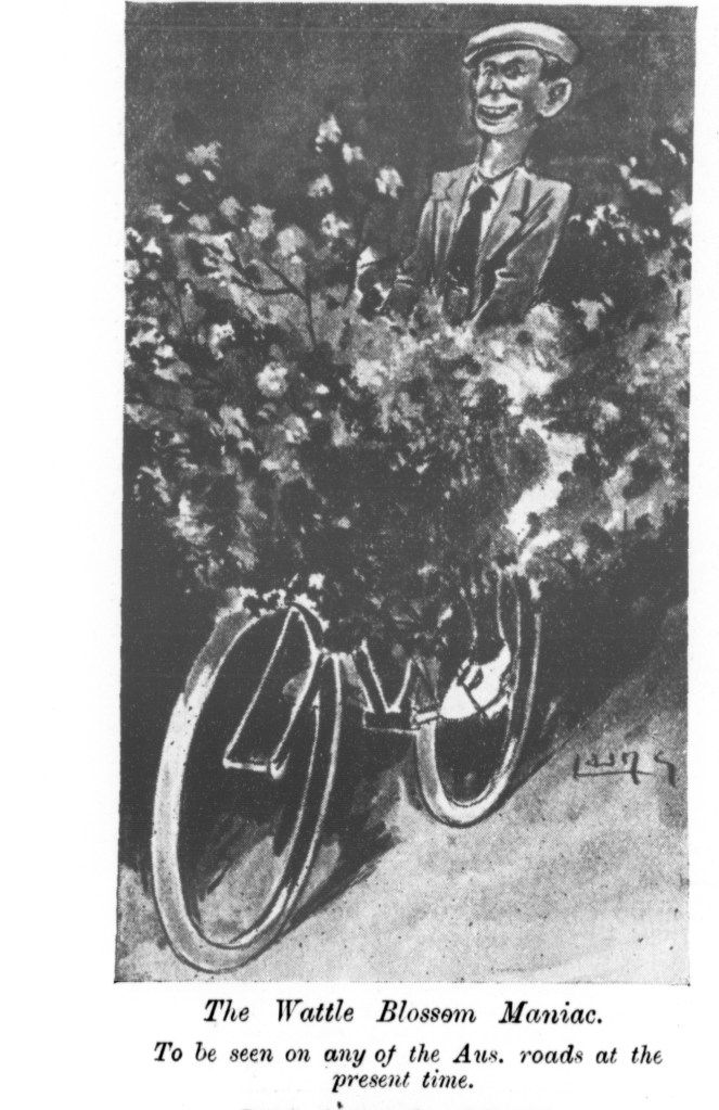 “Australian poets are said to find most of their inspiration, metaphors, similes, etc. from, and in, wattle-blossom. This may be monotonous, but it will not be so for long if the ruthless cyclist is allowed to have his way. On Saturday last I saw bicycle after bicycle coming in from the country each looking like a yellow cheveaux de fleurs —the rider being almost entirely hidden by wattle-blossoms. And the worst of the matter is that these vandals on wheels are not satisfied with merely taking the blossoms—they drag away branches and utterly ruin the trees.”